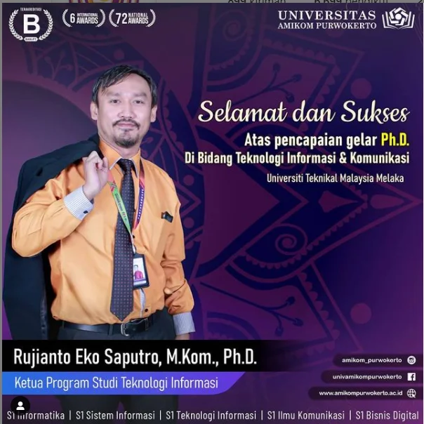 Selamat kepada Kaprodi Teknologi Informasi, Rujianto Eko Saputro, M.Kom., Ph.D. yang telah menyelesaikan studi S3 nya di Universiti Teknikal Malaysia Melaka di bidang teknologi informasi